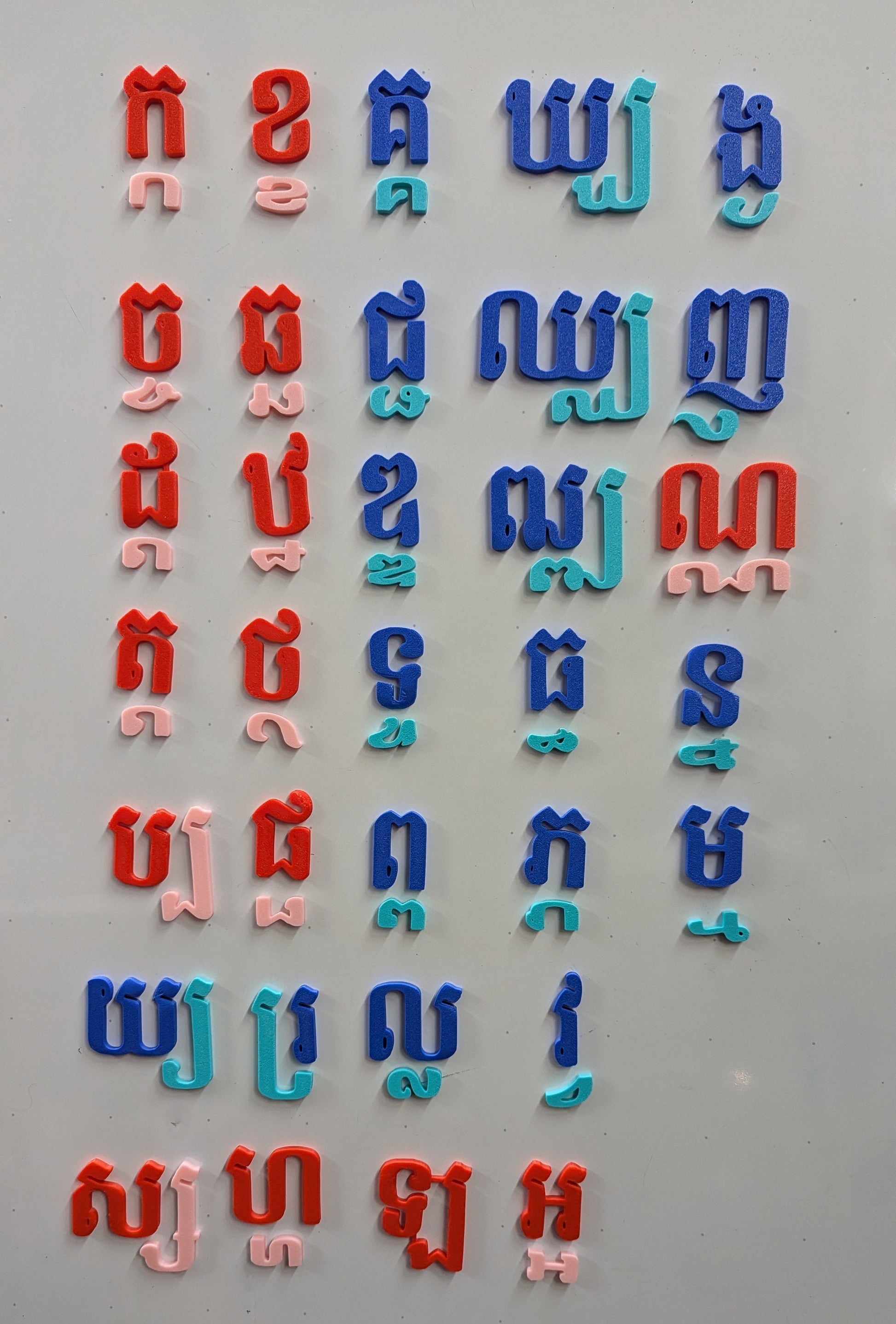 Letters and numbers are 3D printed using polylactic acid (PLA) filament and neodymium magnets. This set only includes the 33 consonants, 33 consonant subscripts, 23 dependent vowels, 15 independent vowels, 10 numbers,13 diacritics and 2 punctuation.